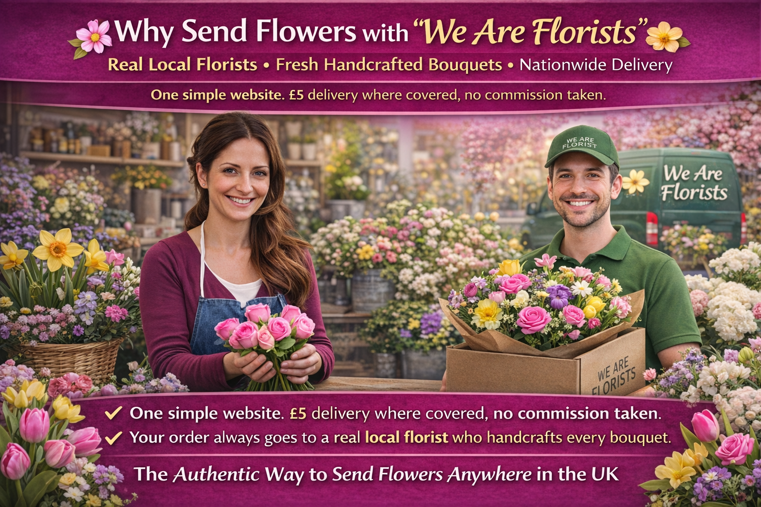 We Are Florists is a national online florist built only for real flower shops. One central site, £5 delivery where covered, and every order sent straight to an independent florist who keeps the full value.
