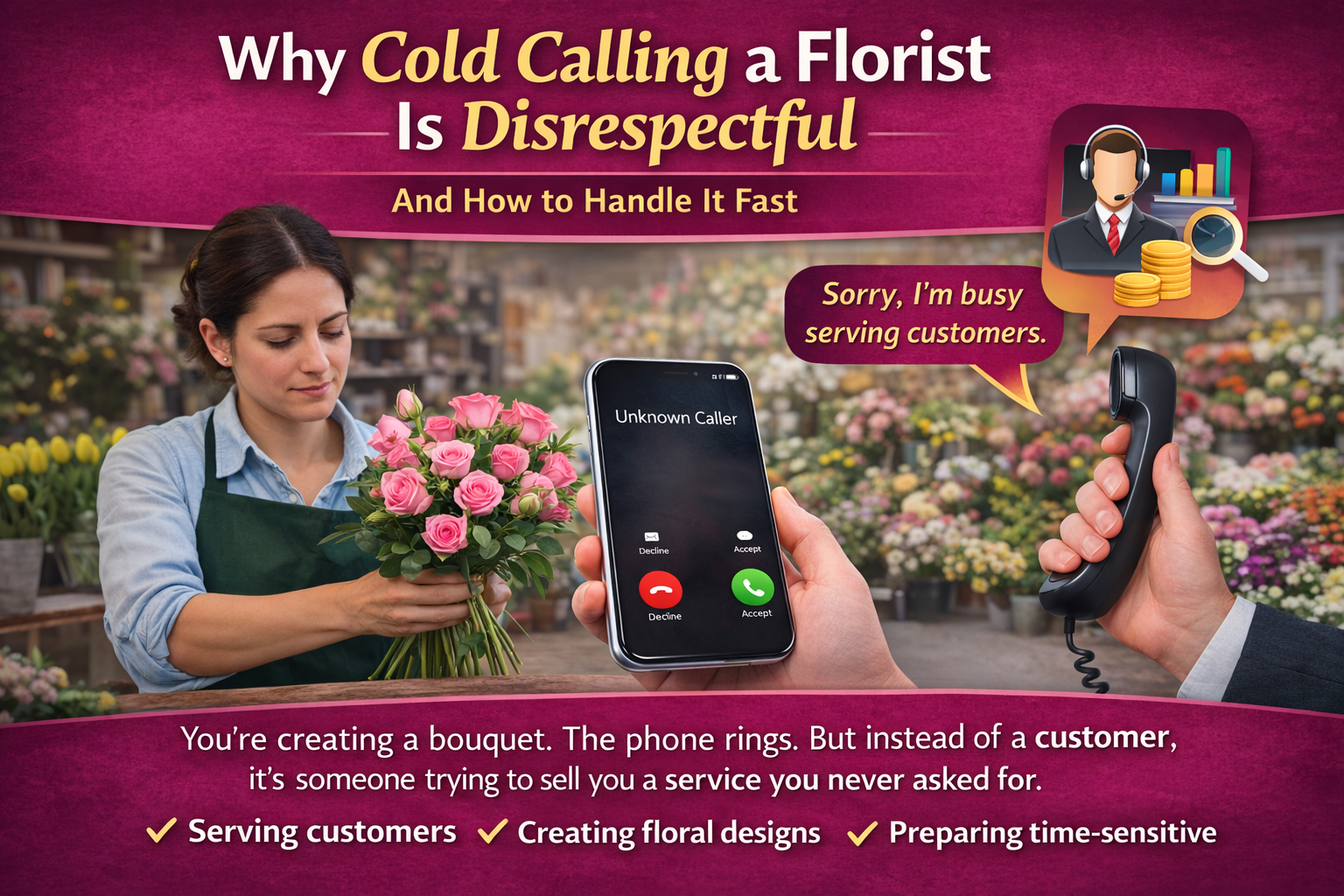 Cold calling a retail flower shop to sell them something over the phone is often seen as disrespectful because it interrupts their work during peak trading hours when they’re serving customers, creating designs, and managing time-sensitive deliveries. Florists are hands-on professionals, not sitting at desks waiting for calls. They're literally on their feet, covered in petals and foliage, racing against the clock to meet same-day delivery promises.